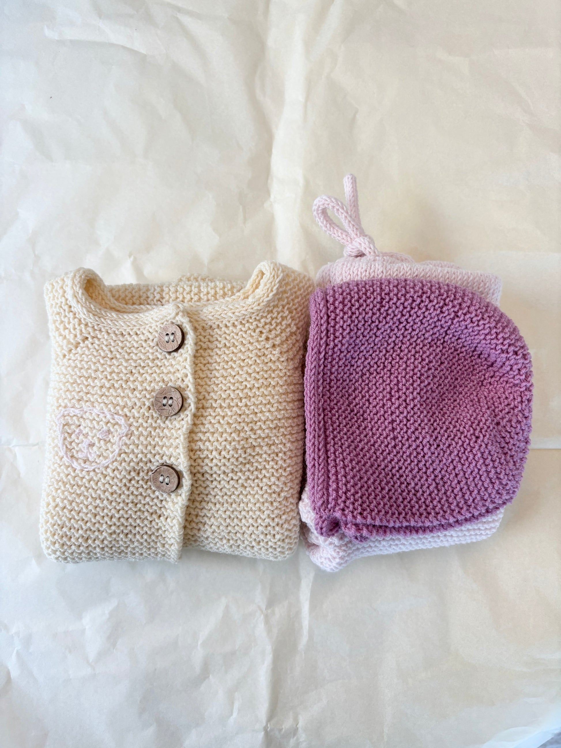 -Babysættet indeholder hue, cardigan og buks.